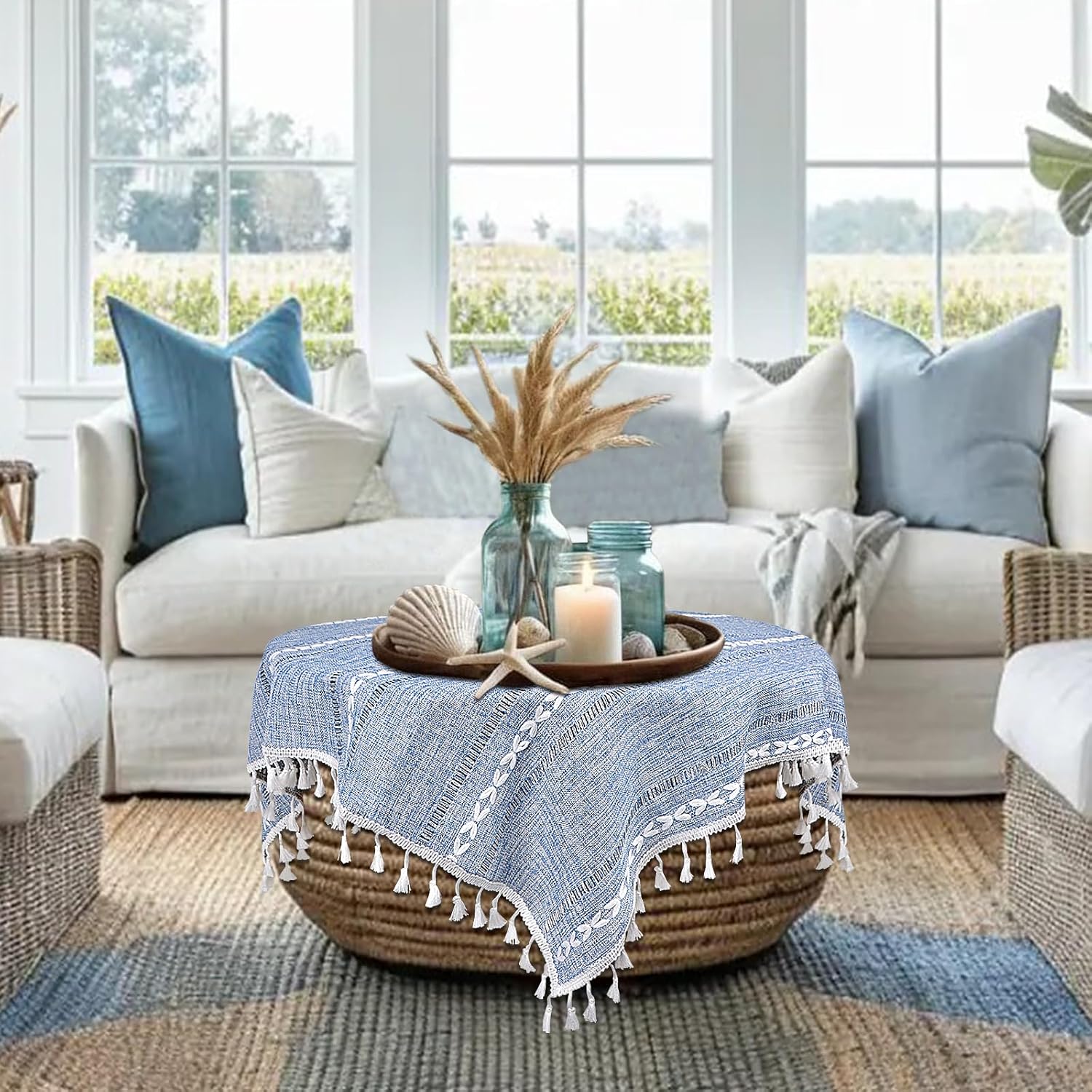 - 【Boho Table Decor】This blue tablecloth is a small-sized tablecloth and suitable for dressers, small square tables, plant stands, storage tables, nightstand table, end bedside tea table (Not suitable for regular tables).