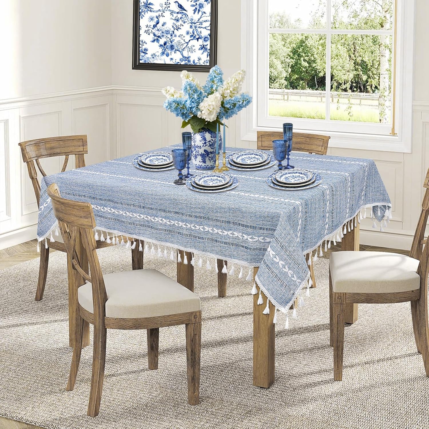 - 【Dusty Blue Square Tablecloth】The small farmhouse table cloth size is 36 x 36 inch with tassels, bedside table cloth, end table runner, nightstand tablecloth, small round table cover. It is recommended that the size of the table is 18-30 inches.